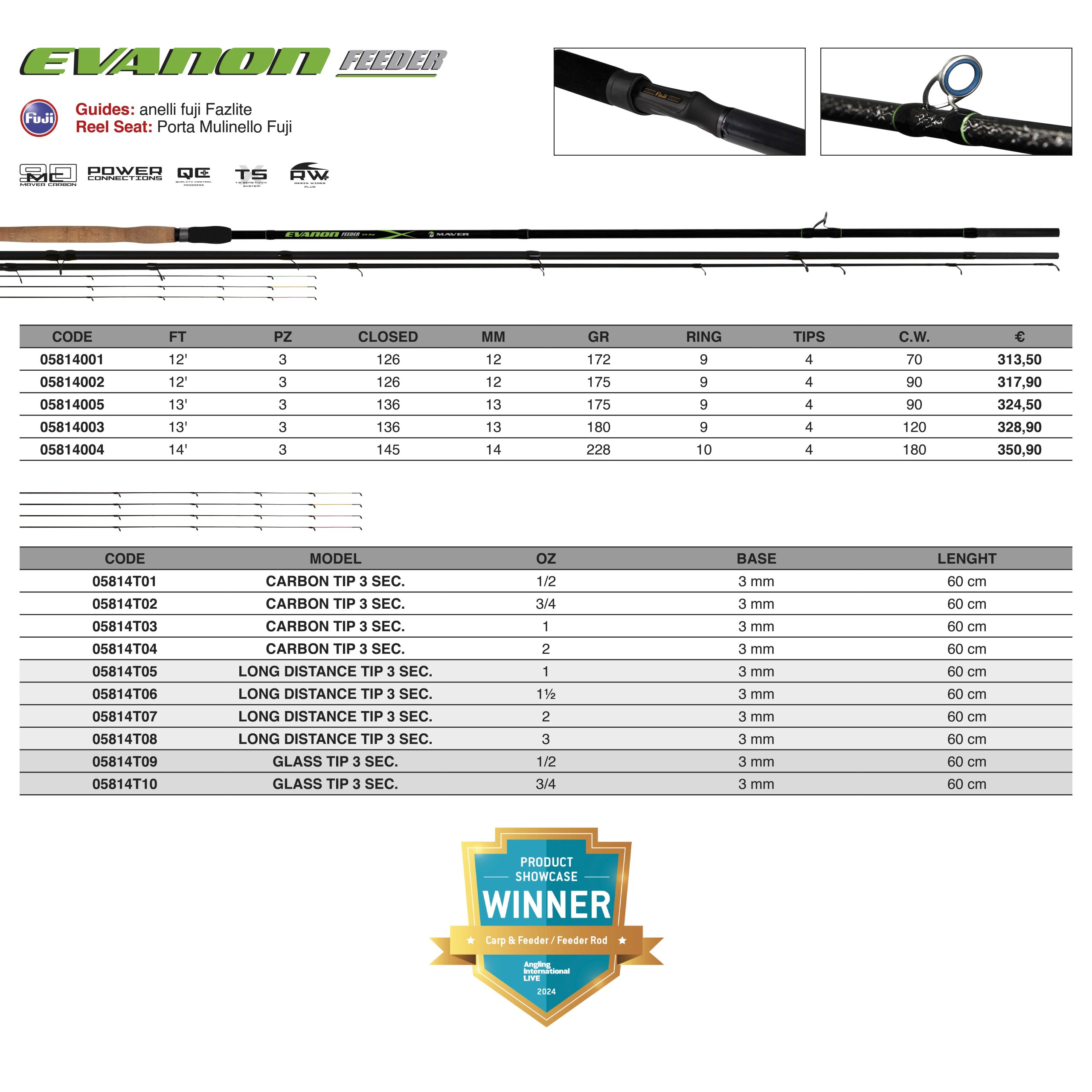 A 2 részből álló Evanon sorozatot általános, kisebb vizeken való horgászathoz hozták létre, 2,2 mm-es spiccek öt különböző teljesítményben, a még soha nem látott puha ¼ oz-os hegytől a 1 ½ oz-os hegyig a legnagyobb kihívást jelentő horgászathoz.